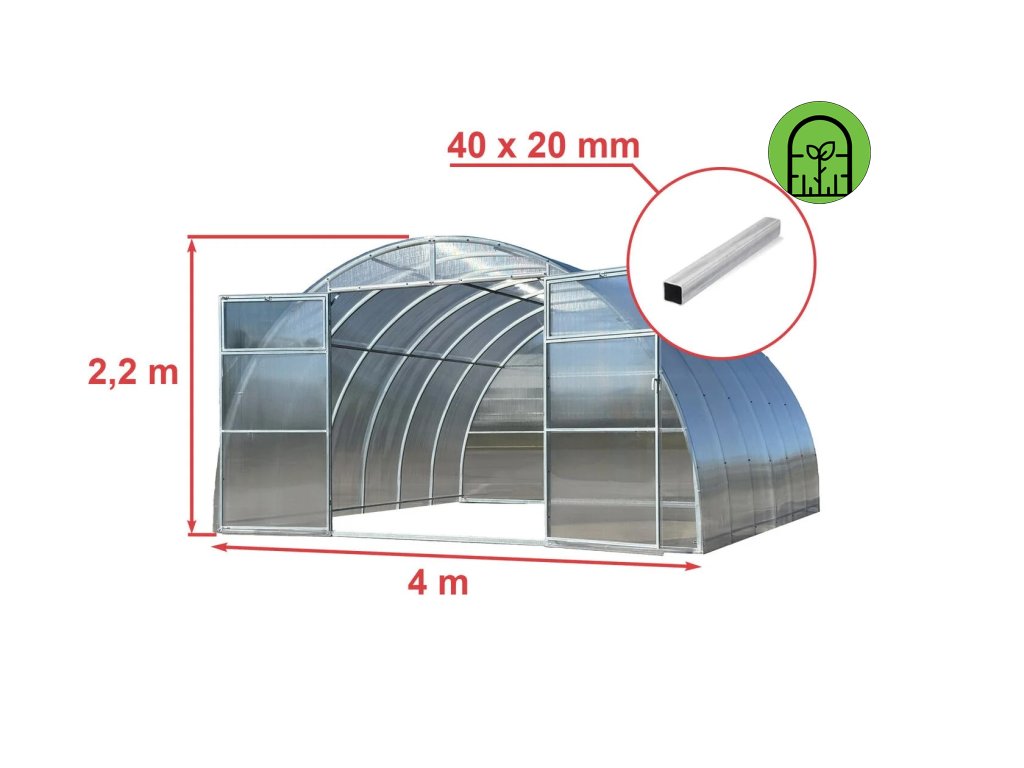 Oblúkový skleník o šírke 4 metre a výške 2,2 metra so zosilnenou konštrukciou oblúka pre vyššiu odolnosť voči zaťaženiu. Konštrukcia vhodná aj pre umiestnenie v náročných poveternostných podmienkach vďaka zosilnenému prierezu profilu oblúka.